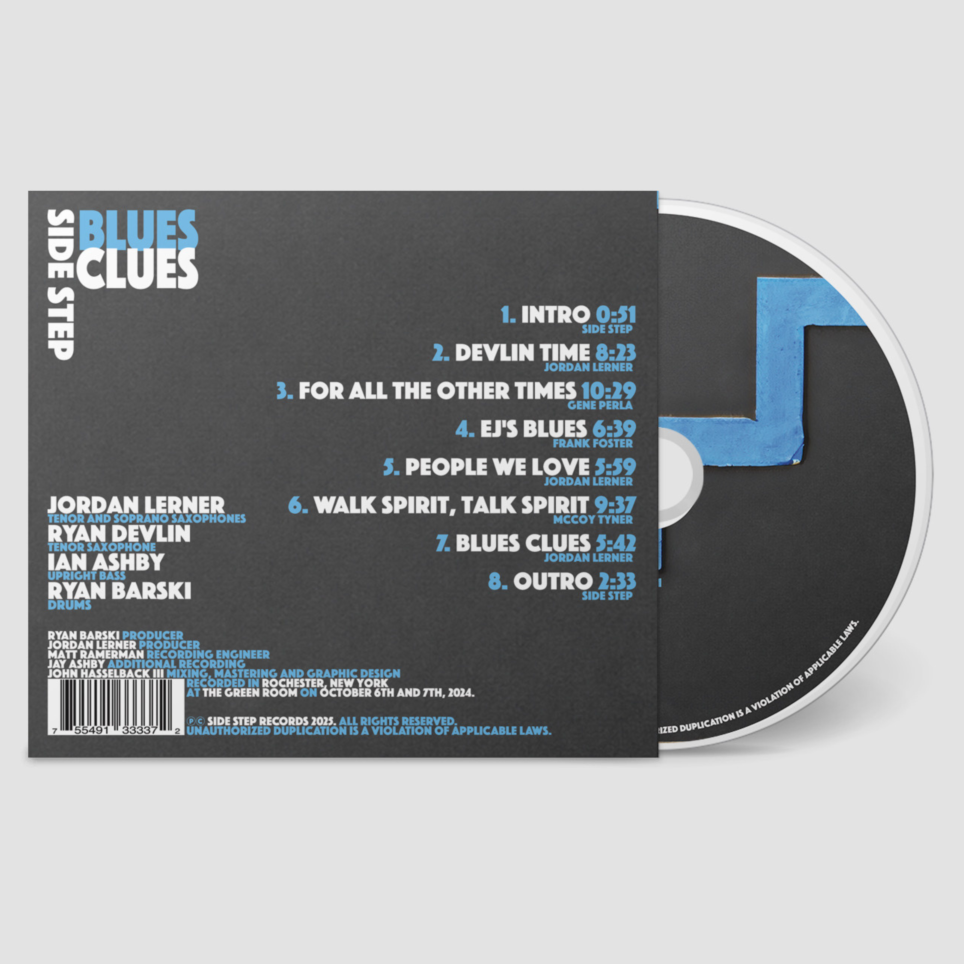 Blues Clues is the debut studio album from Side Step, recorded live at The Green Room in Rochester, NY. The record captures the energy and sound of a band coming into its own direct, honest, and deeply rooted in the modern jazz tradition. Each track was recorded in real time with no overdubs, preserving the natural chemistry between the musicians.